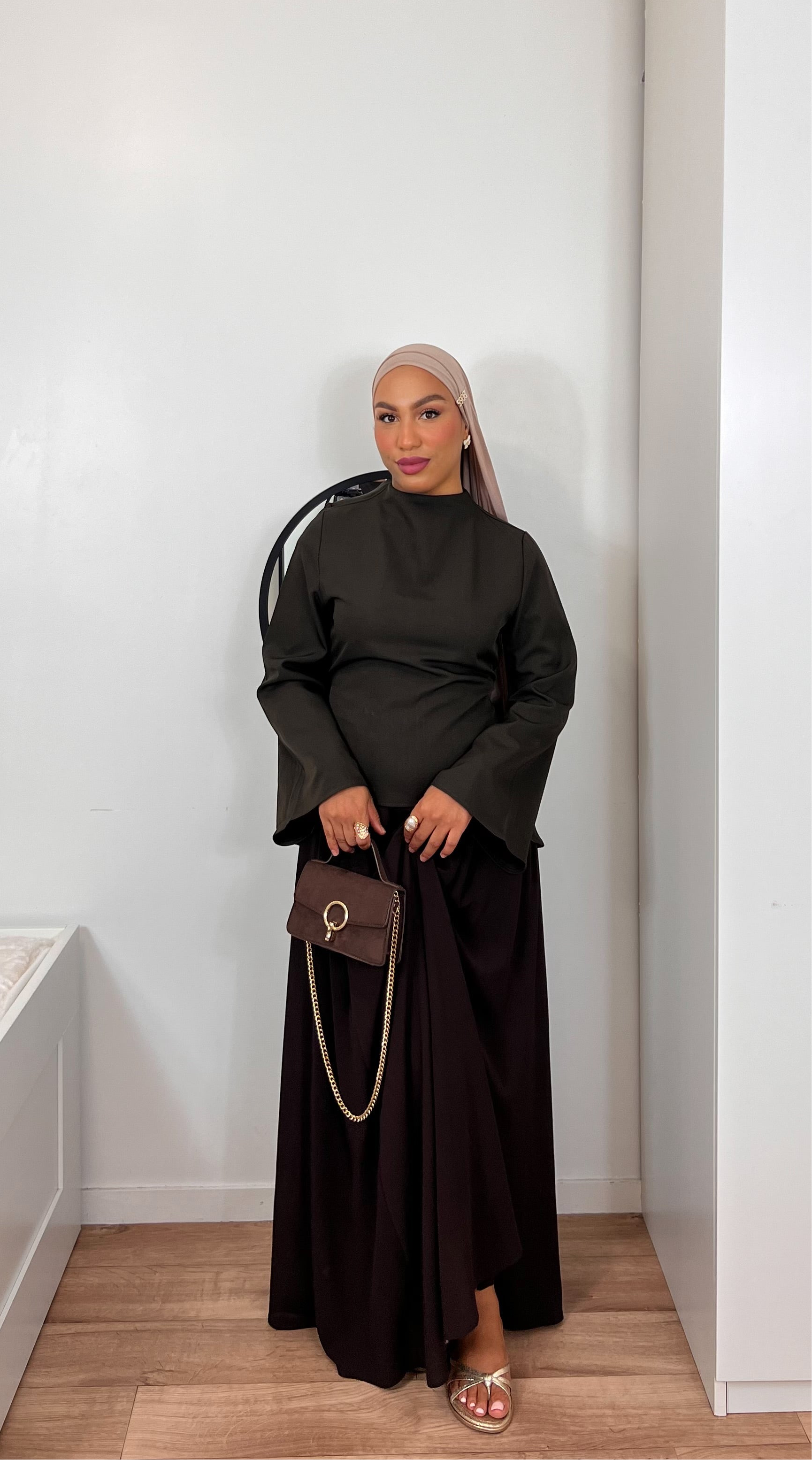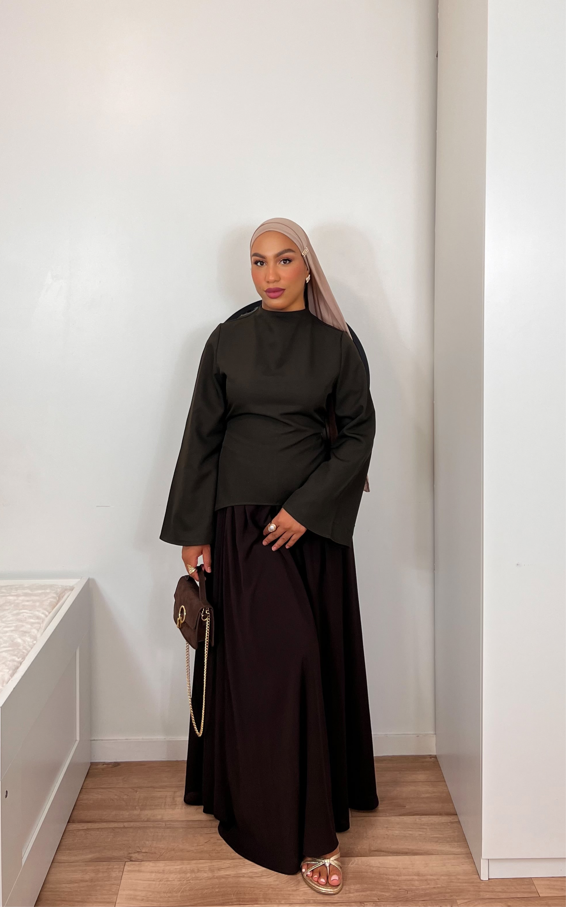 le mannequin porte la taille S elle fait habituellement une taille M , L’ensemble raffiné composé d’un haut asymétrique et d’une jupe longue en mousseline doublée. Confortable et flatteur, il s’adapte parfaitement à toutes les morphologies jusqu’au XL. Prenez votre taille habituelle  ou une taille au dessus si vous voulez un effet un peu plus large .