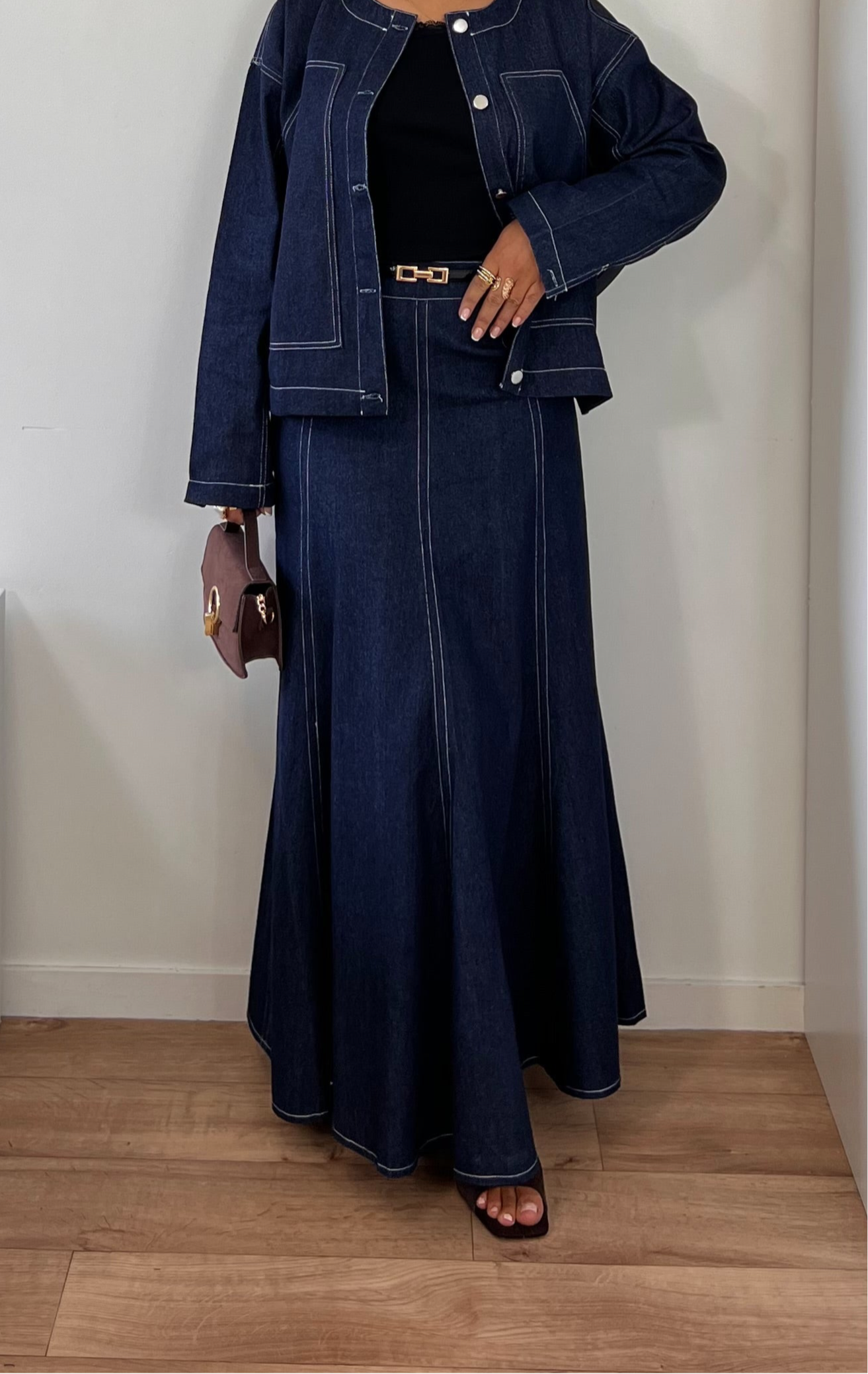 Jupe longue en denim bleu foncé, coupe évasée et fluide. Ses coutures verticales allongent la silhouette et ajoutent une finition élégante. Une pièce intemporelle qui se porte aussi bien en tenue casual qu’habillée. Prenez votre taille habituelle, pour un effet plus large prenez une taille au-dessus.